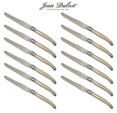 PRODUCT DESCRIPTIONS:12 original French LAGUIOLE Jean Dubost round tip table knives in tempered 15/10 stainless steel - blade : 1.5 mm thickness. Length = 23 cm (9") - weight = approx. 45 grams. * * * Stamped with Laguiole Jean Dubost France. * * * Manufactured in France. * * * Delivered from France in two open wooden boxes with Certificate of Authenticity. * * * Dishwasher safe (note: do not leave in a damp dishwasher). * * * This genuine LAGUIOLE set is suited for any occasion: a dinner party with your friends, your unforgettable Christmas party or simply the daily family dinner. With this exceptional LAGUIOLE silverware set each occasion indeed turns really special! * * * Our LAGUIOLE products also make that special, stylish gift: whether to celebrate a birthday, an anniversary, an engagement or wedding, a promotion or Xmas/New Year, this LAGUIOLE set always will be the