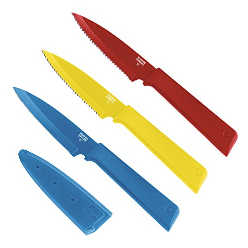 PRODUCT DESCRIPTIONS:Colori+ knives offer convenience through their sharpness, secure-grip handles and lightweight design, making all of your kitchen prep tasks a breeze. The stainless steel blades are super sharp, making short work of cooking tasks. Details: , Handy, all-purpose knife - for all prep tasks in the kitchen. , Paring Knife: perfect for cutting cheese for your sandwich, peeling an apple or chopping vegetables. , Paring Knife Serrated: Perfect for cutting bread, tomatoes and other soft fruits. , Ultra sharp stainless steel blade. , The silicone non-stick coating prevents foods from sticking to the blade. , Sheath included. , Warning: Keep away from children - blade is sharp. Store with sheath. Inappropriate use may lead to injuries. Material: Stainless Steel, PP Plastic, Silicone Set includes: 1 Kuhn Rikon Colori+ Paring Knife, Blue 1 Kuhn Rikon Colori+ Paring Knife, Serrated, Yellow 1 Kuhn Rikon Colori+ Paring Knife, Serrated, Red Manufacturer Item Number: 26596 , Pack contains:1 Kuhn Rikon Colori+ Paring Knife, Blue 1 Kuhn Rikon Colori+ Paring Knife, Serrated, Yellow 1 Kuhn Rikon Colori+ Paring Knife, Serrated, Red