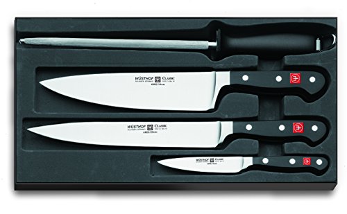 PRODUCT DESCRIPTIONS:Wusthof Classic 4 Piece Cooks Knife Set. Wusthof knives are manufactured by a skilled team of 300 dedicated workers in two state-of-the-art facilities in Solingen, Germany. Production follows strict rules in order to achieve the finest quality, while at the same time remaining environmentally friendly. Wusthof knives are the cherished tools of the world's most distinguished chefs and home cooking enthusiasts.
