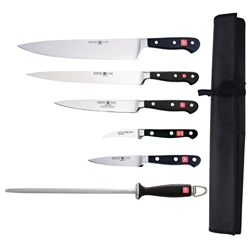 PRODUCT DESCRIPTIONS:Wusthof Trident knives are rated the best in the world by many top chefs. Forged from one solid piece of high carbon stainless steel. This six piece knife set includes: 27cm (10.5") cooks knife, 15cm (6") fillet knife, 25cm (10") slicer, 6cm (2.5") turning knife, 9cm (3.5") paring knife and 30cm (12") sharpening steel, supplied with a roll up nylon wallet to protect and help you transport your knives safely. All these knives have been carefully chosen to be an asset to any professional chef.