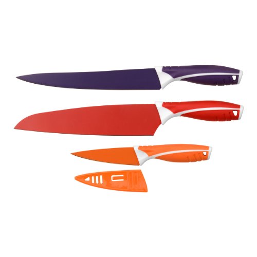 PRODUCT DESCRIPTIONS:3 Piece Knife Set With PP TPR Coated Material Handle. Includes - Red Chef's Knife/Purple Carving Knife/Orange Paring Knife. Enhances the beauty of your kitchen and home