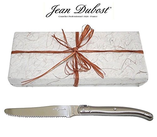 PRODUCT DESCRIPTIONS:Set of 10 original French LAGUIOLE Jean Dubost round tip table knives in tempered 15/10 stainless steel - blade : 1.5 mm thickness. Length = 23 cm (9") - weight = approx. 45 grams. * * * Stamped with Laguiole Jean Dubost France. * * * Manufactured in France. * * * Delivered from France in a free Kraft gift-box with Certificate of Authenticity. * * * Dishwasher safe (note: do not leave in a damp dishwasher). * * * This genuine LAGUIOLE set is suited for any occasion: a dinner party with your friends, your unforgettable Christmas party or simply the daily family dinner. With this exceptional LAGUIOLE silverware set each occasion indeed turns really special! * * * Our LAGUIOLE products also make that special, stylish gift: whether to celebrate a birthday, an anniversary, an engagement or wedding, a promotion or Xmas/New Year, this LAGUIOLE set always will be the