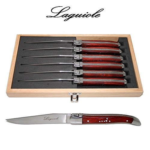 PRODUCT DESCRIPTIONS:Authentic LAGUIOLE : set of 6 steak knives. Handles : rosewood. Blade : 2.5 mm (!) thick stainless steel. Each knife: length = 23 cm (9.1") - weight = approx. 110 grams. * * * Delivered from