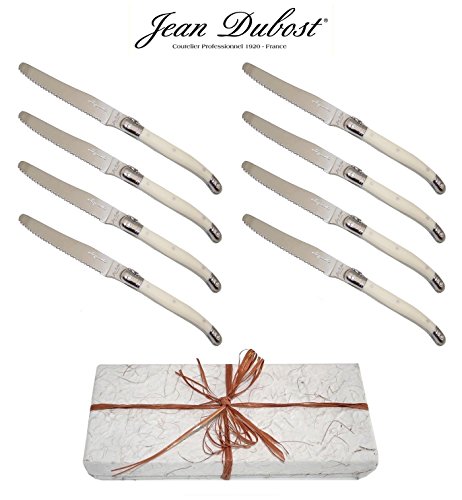 PRODUCT DESCRIPTIONS:Set of 8 original French LAGUIOLE Jean Dubost round tip table knives in tempered 15/10 stainless steel - blade : 1.5 mm thickness. Length = 23 cm (9") - weight = approx. 45 grams. * * * Stamped with Laguiole Jean Dubost France. * * * Manufactured in France. * * * Delivered from France in a free Kraft gift-box with Certificate of Authenticity. * * * Dishwasher safe (note: do not leave in a damp dishwasher). * * * This genuine LAGUIOLE set is suited for any occasion: a dinner party with your friends, your unforgettable Christmas party or simply the daily family dinner. With this exceptional LAGUIOLE silverware set each occasion indeed turns really special! * * * Our LAGUIOLE products also make that special, stylish gift: whether to celebrate a birthday, an anniversary, an engagement or wedding, a promotion or Xmas/New Year, this LAGUIOLE set always will be the