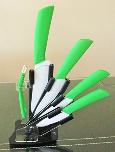 PRODUCT DESCRIPTIONS:Useful and Modern Set of Green Colour Knives, Peeler and Holder. Knives and Peeler Handle Material: ABS Knives and Peeler Blade Material: Zirconium Oxide Set Includes 1 Chef Knife Dimensions: 27.5 cm (11 inches) 1 Utility Knife Dimensions: 23.7 cm (9.3 inches) 1 Fruit Knife Dimensions: 20.6 cm (8.1 inches) 1 Paring Knife Dimensions: 18 cm ( 7 inches) 1 Ceramic Peeler Dimensions: 12.8 cm (5 inches) 1 Knives Holder This Set is easy to assemble. Ceramic Knives are modern innovation designed to improve your culinary experiences. The hardness, strength and corrosion resistance of Zirconia (ZrO2) Ceramic, provides significant advantages compared to traditional stainless steel knives: the ceramic blade will hold its edge much longer than regular steel, go literally years without re-sharpening, ceramic knives do not leave behind any metallic taste or smell. The Ceramic Knife is an environmental friendly and chemically stable product, which is rust-free and non-corrosive. They're made out of a high-purity zirconium oxide powder so they have an extremely-hard blade, nearly as hard as diamonds. No metallic taste or smell A quick rinse in warm water can give your ceramic knife much clean than a thorough scrubbing on a metal knife. Lightweight and Rusteless (There is no metal) Care With proper care, these ceramic kitchen knives will hold its sharpness for literally years without resharpening. Please use on a plastic or wood cutting board. Rinse in warm water or gently hand wash using a mild detergent in warm water. Do NOT DROP the knife as this can cause the blade to break. Do not use the knife for grating. Do not use the knife as a lever. Do not twist the knife during the cutting process. Do not use to cut frozen goods, bones or fish bones. Do NOT WASH the knife in a DISHWASHER. Store the knife in a conventional knife block or other stable environment. KEEP THE KNIFE AWAY FROM CHILDREN. Do not try to re-sharpen the knife by yourself. Avoid using abrasive pads or powders.