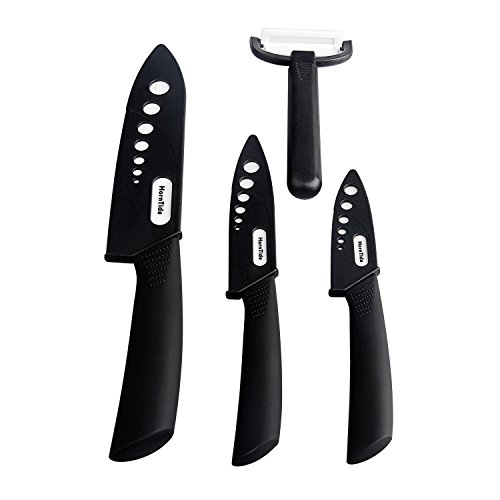 HornTide ceramic knives set 4-piece kitchen cutlery comes with 6-inch Chef, 4-inch Utility, 3-inch Paring, 1 Peeler and free blade sheaths. Non-Slip Grip handles are ergonomically designed to maximize your culinary experience.