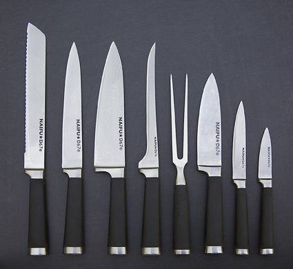 PRODUCT DESCRIPTIONS:THIS CHEF SET INCLUDES: Free knife sharpener Chef's knife roll 8" Slicer/Carving knife 8" Chef knife 6" Chef knife 7" Filleting/boning knife 5" Utility knife 3.5" Paring knife 9" Bread knife Meat fork Our NAIFU D67 chef knives are made from Japan's unique Damascus 67 layered steel. Truly razor sharp, these professional knives are acclaimed by chefs and keen cooks alike. Honed by hand each knife blade acquires its own unique marbled appearance. - Supreme lasting sharpness - Prices at least 30% less than comparable ranges from others - 30 day full refund & 10 year guarantee - Ergonomic santoprene slip resistant handle grips - Excellent weight and balance - Free chef's knife sharpener