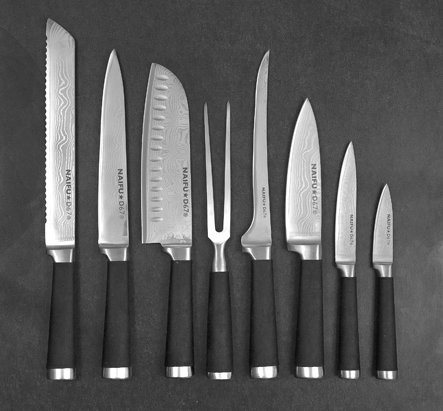 PRODUCT DESCRIPTIONS:THIS CHEF SET INCLUDES: Free knife sharpener Chef's knife roll 9" Bread knife 8" Slicer/Carving knife 7" Santoku knife Long prong fork 7" Filleting knife 6" Chefs knife 5" Utility knife 3.5" Paring knife Our NAIFU D67 chef knives are made from Japan's unique Damascus 67 layered steel. Truly razor sharp, these professional knives are acclaimed by chefs and keen cooks alike. Honed by hand each knife blade acquires its own unique marbled appearance. - Supreme lasting sharpness - Prices at least 30% less than comparable ranges from others - 30 day full refund & 10 year guarantee - Ergonomic santoprene slip resistant handle grips - Excellent weight and balance - Free chef's knife sharpener