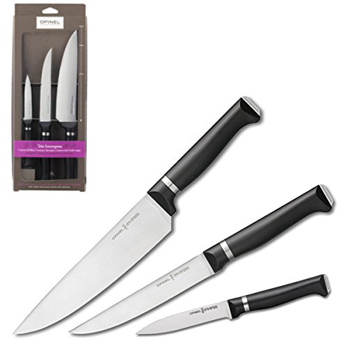 PRODUCT DESCRIPTIONS:Set of 3 knives composed of a n°218 knif Chef multi-function (20cm blade), a n°220 Cutting knif (16cm blade) and a n°225 Paring knif (10cm blade). The blades are in stainless steel Sandvik. Handle in POM charged in fibreglass. Since 1890, Opinel is manufacturing its knives in the Alps of France.