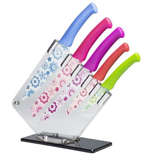 PRODUCT DESCRIPTIONS:5 piece knife set with clear acrylic knife block to house them Set comprises: 20cm Bread Knife, 20cm Carving Knife, 20cm Cooks Knife, 13.5cm All Purpose, 9cm Paring Soft non slip handles