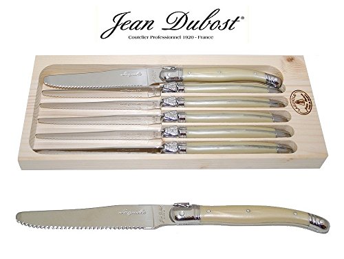 PRODUCT DESCRIPTIONS:Set of 6 original French LAGUIOLE Jean Dubost round tip table knives in tempered 15/10 stainless steel - blade : 1.5 mm thickness. Length = 23 cm (9") - weight = approx. 45 grams. * * * Stamped with Laguiole Jean Dubost France. * * * Manufactured in France. * * * Delivered from France in an open wooden box with Certificate of Authenticity. * * * Dishwasher safe (note: do not leave in a damp dishwasher). * * * This genuine LAGUIOLE set is suited for any occasion: a dinner party with your friends, your unforgettable Christmas party or simply the daily family dinner. With this exceptional LAGUIOLE silverware set each occasion indeed turns really special! * * * Our LAGUIOLE products also make that special, stylish gift: whether to celebrate a birthday, an anniversary, an engagement or wedding, a promotion or Xmas/New Year, this LAGUIOLE set always will be the