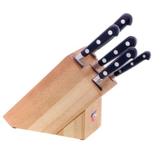 PRODUCT DESCRIPTIONS:In the classic French cook's style and superbly crafted in fully forged stainless steel, the Stellar Sabatier knife range offers knives for many different uses to cover all kitchen cutting jobs. This set contains an IS01 9cm Paring Knife, IS03 10cm Utility Knife, IS08 20cm carving knife, IS14 20cm Bread Knife, IS16 15cm Cooks Knife and an attractive beech knife block for storage