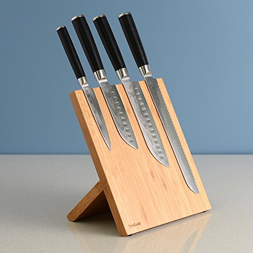 PRODUCT DESCRIPTIONS:Crafted from Japanese Damascus steel rated the best in the world. Our Damascus knives each feature the Japanese symbol for strength. 67 layer blade with a super hard central core (VG10) which is suported by 66 layers of steel. The strength & sharpness provided by this construction is surpassed by no other blade. G10 is material formed by layers of fibreglass cloth coated in epoxy resin. To form the solid handle this is then compressed and baked for outstanding results.Contains: 13cm/5in utility knife 13cm/5in & 18cm/7in santoku knives 23cm/9in bread knife & bamboo magnetic block. Separates available search for ProCook Damascus Knives for the rest of the range & set offers! 2 x 4 piece sets & 5 piece set are also available.Knives should be hand washed then dried before being stored in a block or on a magnetic rack. Not dishwasher safe.ProCook design manufacture & supply innovative products and are passionate about quality and service. This product has a 25yr Guarantee with ProCook.Please note under the Criminal Justice Act 1988 (as amended) we are only allowed to sell knives to persons aged 18 and over.