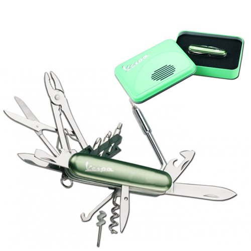 PRODUCT DESCRIPTIONS:VESPA knife Multifunction Vespa pocket knife contains 11 different functions, some purely mechanical inspiration (knife, corkscrew, bottle opener, scissors, pliers, can opener, hook, multi tools ...) It is useful in any circumstance but is mostly an accessory for your scooter. Stainless steel blade, safety catch Blade: 7 cm It will be delivered in a gift box black metal