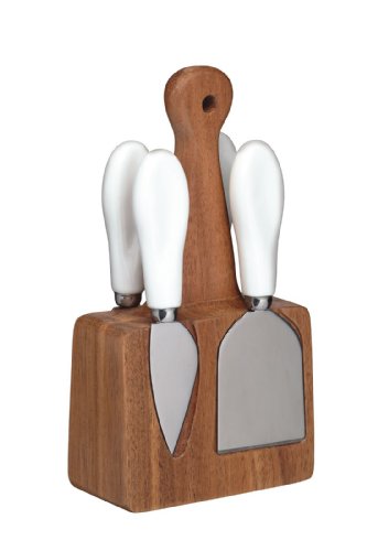 PRODUCT DESCRIPTIONS:A great combination of natural materials to present a simple and stylish cheese knife set. Tactile ceramic handles are fused to durable stainless steel blades and displayed on a natural acacia wood stand. Including three cheese knives and a cheese fork, it is an easy and essential addition to any cheese board. Block measures 10cm wide x 5cm deep and 18.5cm high. Each knife/fork is approximately 14cm long. Knives are dishwasher safe. Wooden knife block is wipe clean only. 5 year guarantee. Not to be sold to persons under 18 years.