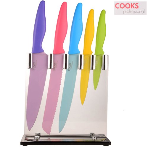 Cooks Professional 5 Piece Non Stick Coloured Knife Set with Clear Acrylic Block Stand