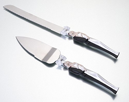 PRODUCT DESCRIPTIONS:This set includes one 14.75" cake knife and one 12.25" cake server. Both are made of stainless steel. The handle is made of painted resin depicting a bride and groom. Also available in African-American