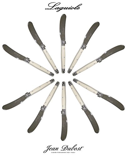 PRODUCT DESCRIPTIONS:AUTHENTIC LAGUIOLE : 10 original French Jean DUBOST LAGUIOLE butter knives. * * * Each knife : length = 15.50 cm (6") - weight = approx. 20 grams. Manufactured in France. Delivered from France in two open wooden boxes with CERTIFICATE OF AUTHENTICITY. * * * This genuine LAGUIOLE set is suited for any occasion: a dinner party with your friends, the yearly Christmas party or the daily family dinner. With this exceptional LAGUIOLE silverware set each occasion indeed turns really special! * * * Our LAGUIOLE products also make that special, stylish gift: whether to celebrate a birthday, an anniversary, an engagement or wedding, a promotion or Christmas/New Year, this LAGUIOLE set always will be the perfect present. * * * For our complete French LAGUIOLE cutlery + steak knives range (more than 400 products!) : please visit our shop ("FRENCH-DIFFUSION")
