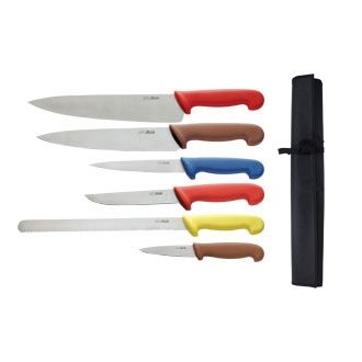 PRODUCT DESCRIPTIONS:Improve kitchen hygiene and help to prevent cross contamination with colour coded knives. High quality stainless steel blades and dishwasher proof handles. Supplied in a black knife wallet.