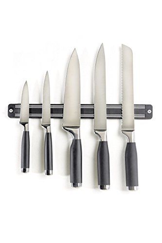 PRODUCT DESCRIPTIONS:Set of 5 high quality knives with stainless steel blades and soft grip handles. Comprises 18cm (7") large carver, 20cm (7¾") carver, 20cm (7¾") bread, 13cm (5") utility and 10cm (4") paring knife (blade lengths). Complete with 33cm (13") magnetic wall strip (fixings included). Not to be sold to persons under 18 years of age.
